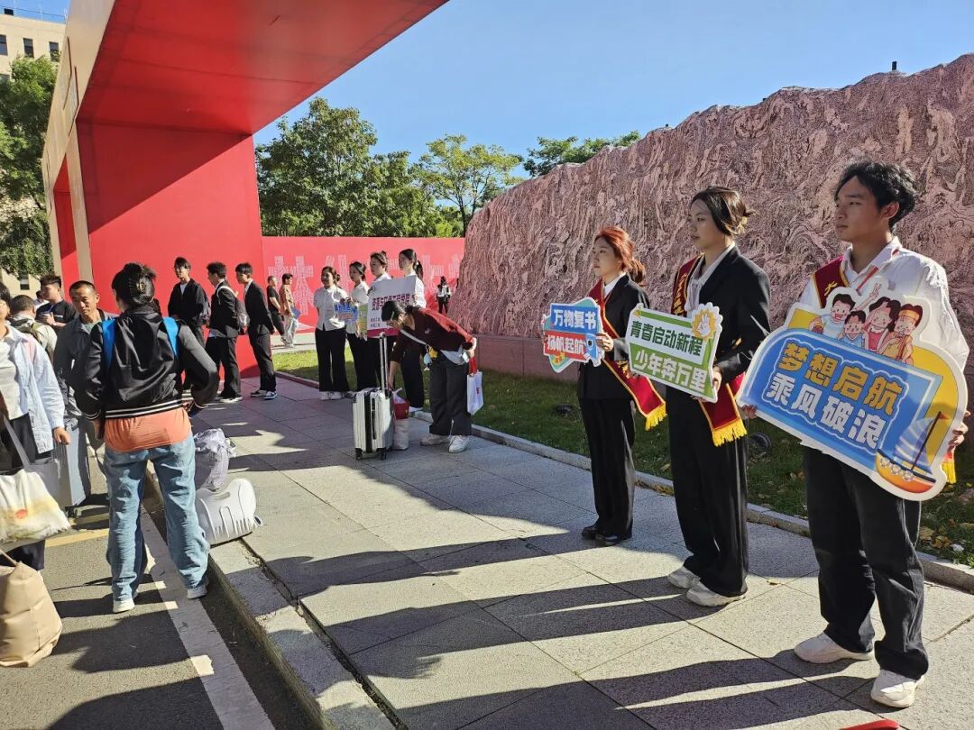 校园门口,同学们手持“梦想启航 乘风破浪”等欢迎牌,用诚挚的面容传递着校园的温暖与活力,为新生开启大学之旅送上第一份热烈的祝福。