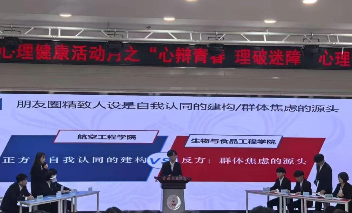 决赛于6月6日下午在我校图书馆报告厅举行,共分为两场。第一场由航空工程学院和生物与食品工程学院率先登台,围绕"朋友圈精致人设是自我认同的建构还是群体焦虑的源头",双方你来我往,辩论激烈。最后,生物与食品工程学院凭借更有说服力的论证和出色表现,拿下了这场比赛的胜利晋级。