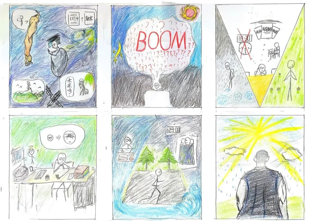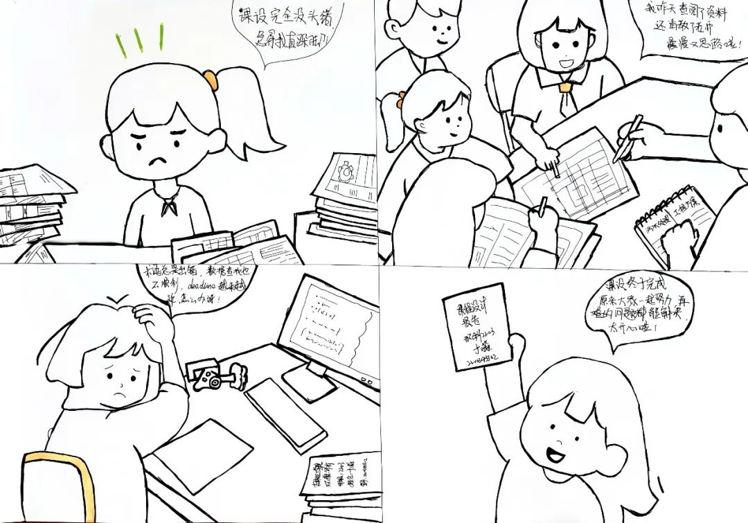 作品简介:围绕课设难题,从选题公布时被晦涩术语“轰炸”的挫败,到思路陷入僵局的焦虑,再到查阅资料、反复尝试的执着,最后是攻克难题的欣喜,我用《课设难题的破局之路》这四格漫画,生动记录了我们团队并肩突围、收获成长的全过程 。
