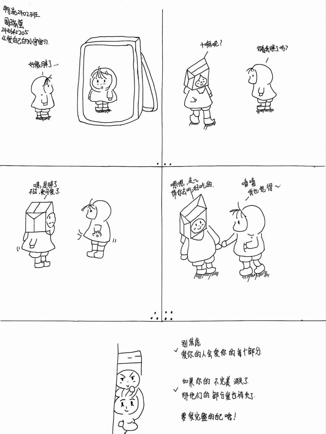 作品简介:以五格漫画展现主人公对身材变化的心态转变, 从担忧变胖,到朋友鼓励,再到领悟爱自己 的真谛。结尾的文字点明主旨,传达出要接纳不完美、爱完整自我的积极态度,是对自我关爱的美好诠释。