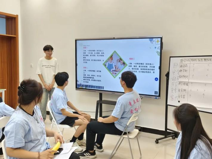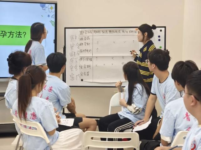 在知识讲解环节,主持人郑美洋以“常用的避孕方法有哪些?”开启互动讨论,引导各小组从有效性、适用性等角度展开头脑风暴。梳理避孕药、安全套等主流方法的科学原理,重点演示了安全套规范使用流程,并组织分组实操演练。这种讲解—讨论—实践的同伴教育模式,使同学们在互动中深化认知,切实掌握科学避孕技能。