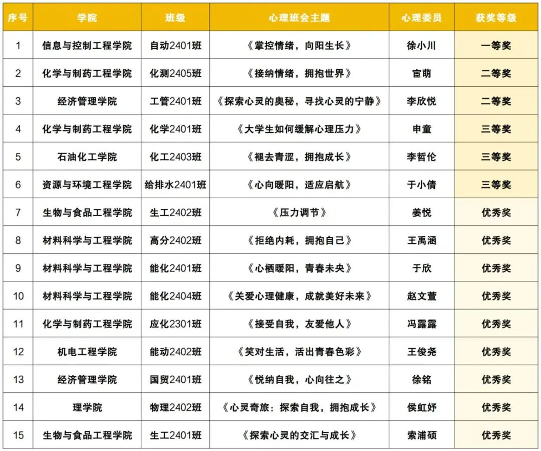 让我们衷心祝贺以上获奖班级!期待他们充分发挥朋辈示范作用,以获奖作品为蓝本,在校园内持续传播心理健康理念,带动更多同学重视心理调适,共同营造阳光向上的校园心理文化氛围。